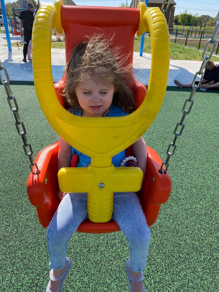But on our walk back to the swing, something happened. As I looked around the park, there were kids of all ages. All doing things that kids their age should be able to do. There were kids playing tag and making music on a gigantic xylophone, but this one got me. There was a three or four year old girl (Opal’s age) and she looked at the swing Opal was about to hop in, and said, “I don’t want to swing in the baby swing.” Tears welled up in my eyes because it was the only swing my child could sit in. She can’t sit in a “regular” swing because she would lose her balance and fall out. She has to sit in the swings that are meant for the kiddos with special needs, the ones that look like massive chairs with a harness that roller coaster rides have.